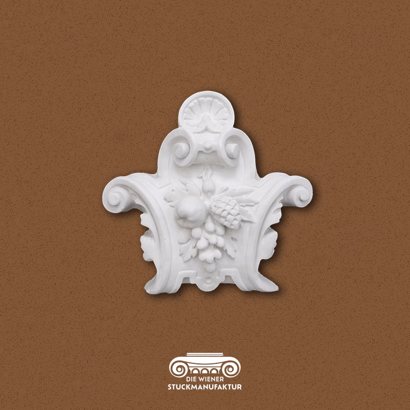 Stuck Obstkartusche 380/360mm aus Gips. Zu dieser Obstkartusche haben wir auch passende große sowie kleine Seitenstücke in unserem Sortiment. Es lässt sich aber auch hervorragend mit anderen Stuck Dekorelementen kombinieren.