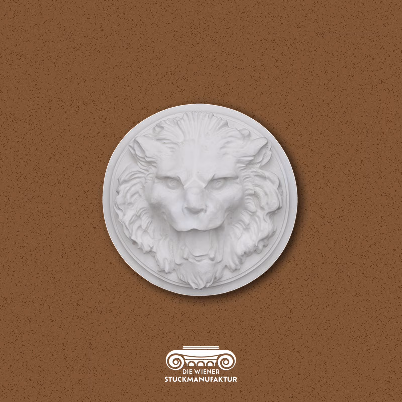 Stuck Löwenkopf d=350mm aus Gips. Dieses Produkt lässt sich hervorragend mit anderen Dekorelementen kombinieren.