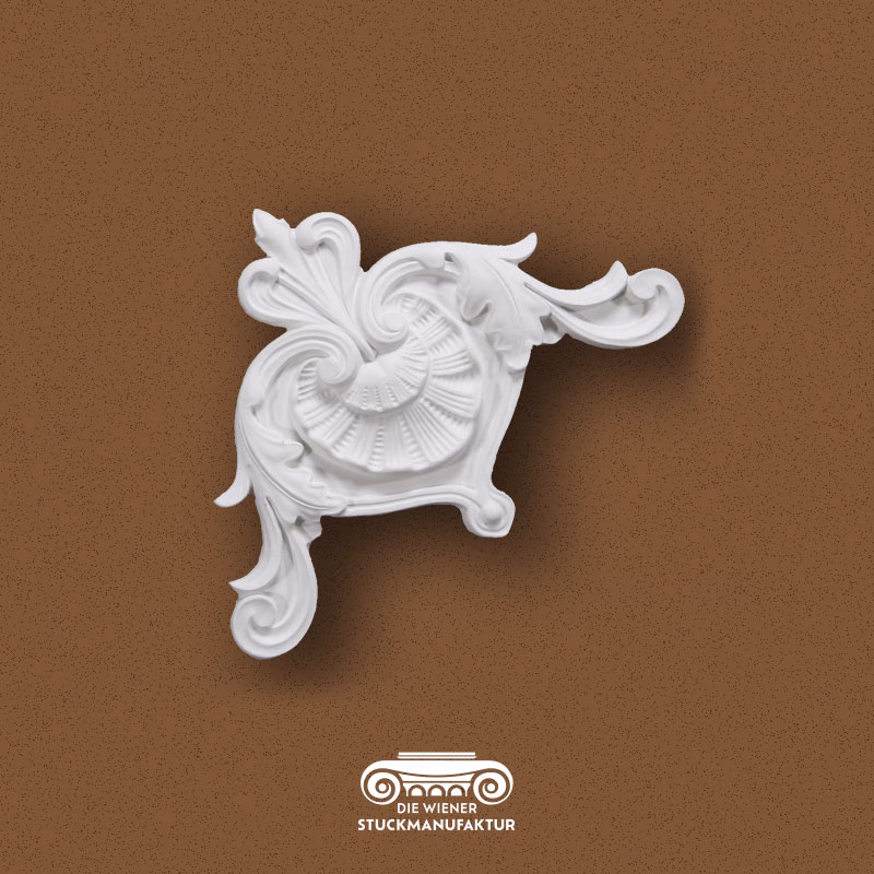 Stuck Freie Dekorecke 230/230mm aus Gips. Dieses Stuck Eckelement lässt sich hervorragend mit anderen Stuckelementen aus unserem Sortiment kombinieren.