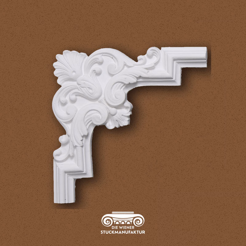 Stuck Ecke 200/200mm zu L0720 aus Gips. Zu diesem Eckelement haben wir auch die passende Leiste und eine weitere Ecke zur Gestaltung von Deckenspiegeln und Wandfeldern in unserem Sortiment.