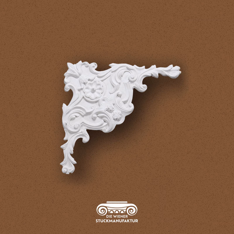 Stuck Freie Dekorecke 300/300mm aus Gips. Dieses Stuck Eckelement lässt sich hervorragend mit anderen Stuckelementen aus unserem Sortiment kombinieren.