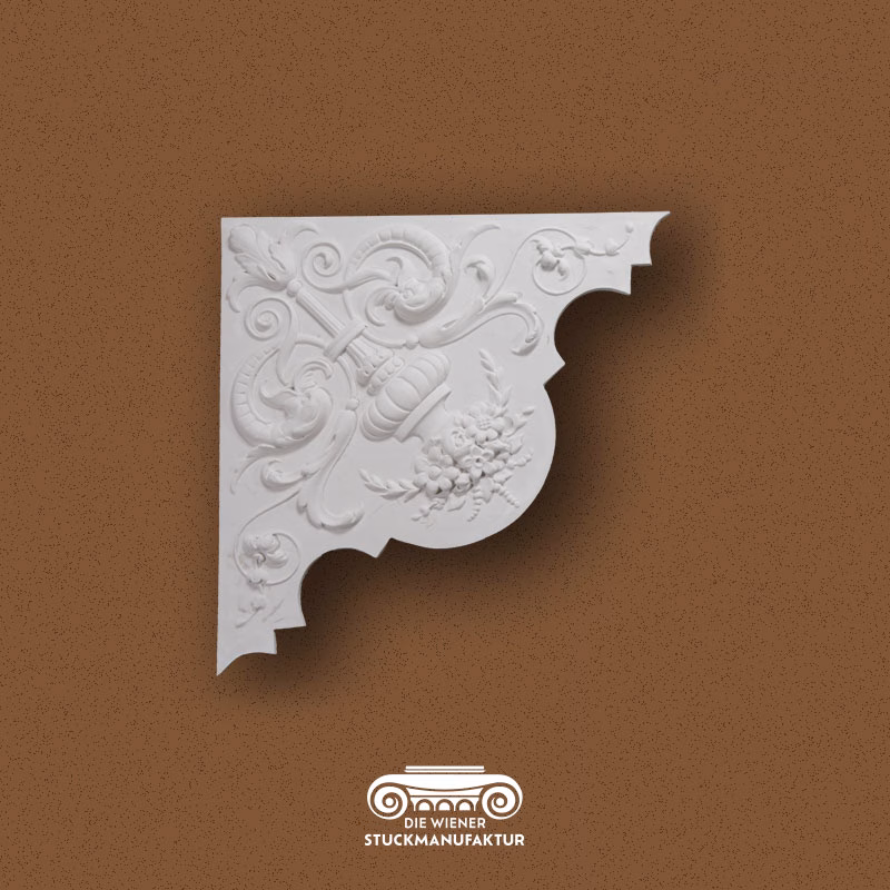 Stuck Freie Dekorecke 425/425mm aus Gips. Dieses Stuck Eckelement lässt sich hervorragend mit anderen Stuckelementen aus unserem Sortiment kombinieren.